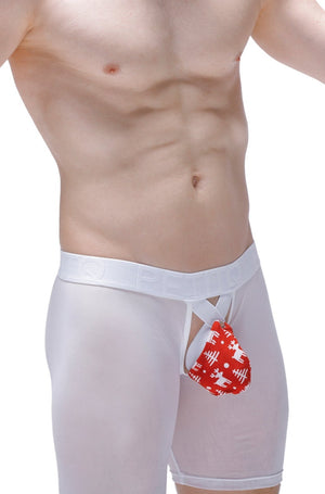 Lange, transparente Boxershorts aus feinem Stretch-Mesh. Vorne befindet sich ein abnehmbarer Beutel, an dem eine Art elastischer Penisring befestigt ist. Der Beutel ist aus Modal gefertigt und in weihnachtlichen Farben bedruckt.