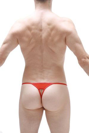 Roter Tanga mit interessanter Rückseite und ohne Tasche vorne, sodass die Geschlechtsteile frei bleiben, mit Kette und Stoffring.