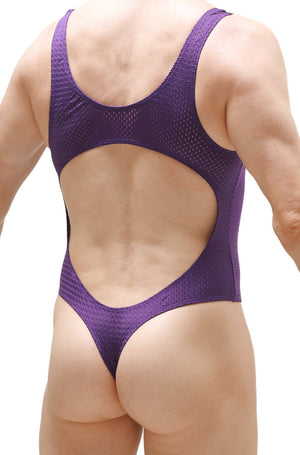 Purple bodystring for men with open back and thong at the back. Slightly openwork material.