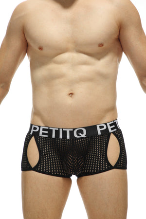 Black sheer boxer shorts with three openings: on the sides and at the back on the buttocks. Black PetitQ waistband. Slightly tight at the thighs.