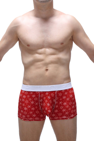 Red boxer shorts with snowflake print. Seamless front pouch. White stitching to match the waistband. Fits a little large.