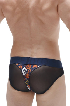 Sexy sheer black mesh briefs with a thong shape at the back and a pouch. Fun Halloween print.