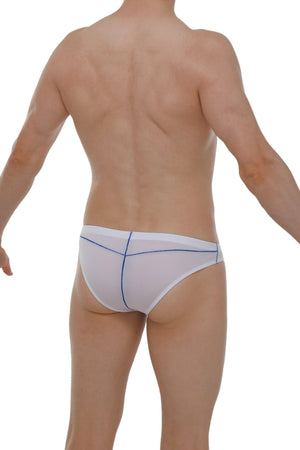 Its design features a classic brief cut with a curved front pocket . It is enhanced with sky blue contrast stitching to contrast with the white, adding a subtle yet striking detail to the garment. Its low rise and soft fabric make it a versatile and comfortable choice for everyday wear.